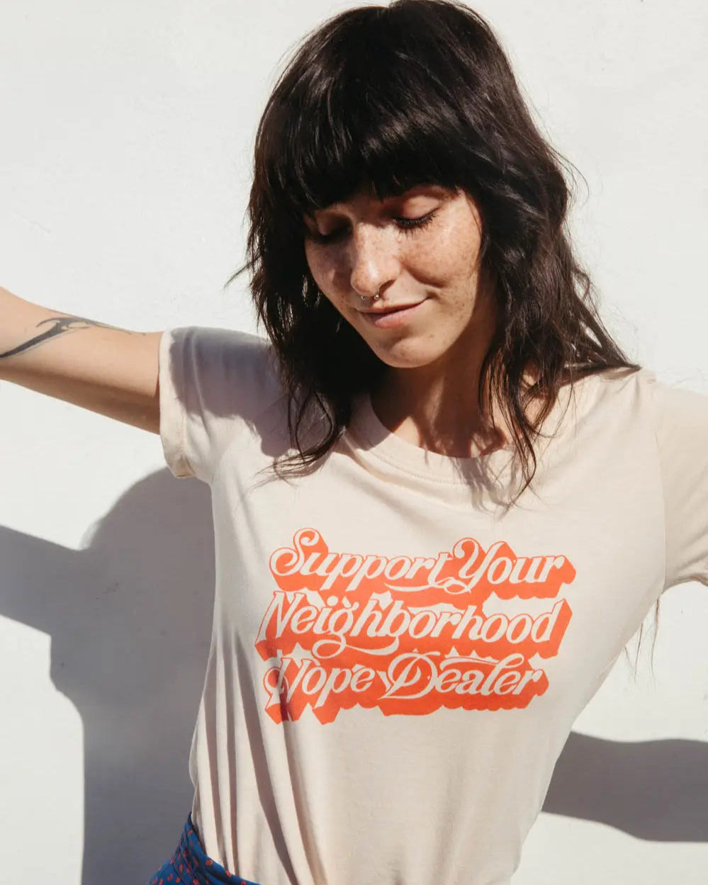 Professionally screen printed on The Bee and The Fox classic fitted tee in peachy pink. 50% cotton 50% polyester