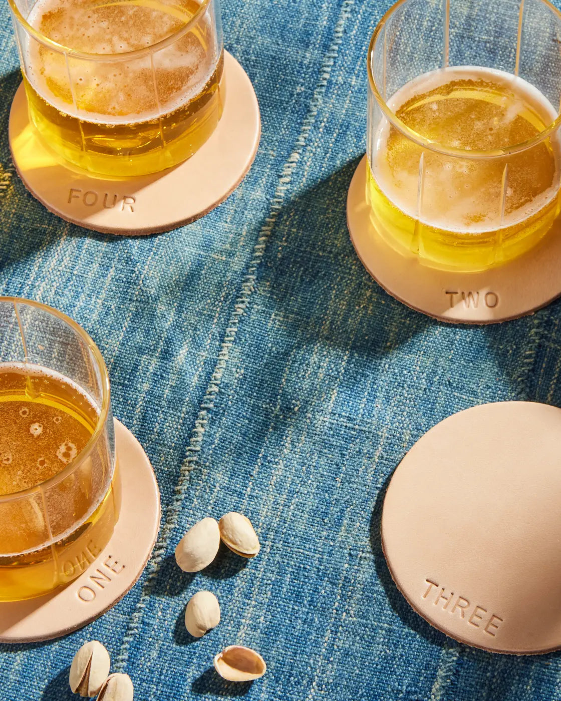 Crafted with lettering in sets of four—ONE-TWO-THREE-FOUR— Celina's Tampa studio offers you a captivating accent for your drinks and food. At 3.5" wide, these slick coasters will take on a character all their own with time as liquid spots age on the leather. You'll have plenty of witty retorts with these conversation-starting accessories adorning your table! The ideal present for the cocktail enthusiast in your life, these coasters will prove they have excellent taste -- and you'll adore watching them grow and acquire their own unique character over time! Sold in set of 4 Tan Leather Handpresses. Packed in a linen bag.